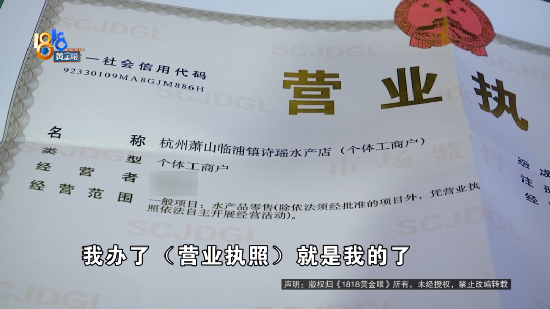 杭州萧山临浦金杰海鲜批发店 老板娘:对对,转手过来,我办了(营业执照)就是我的了。